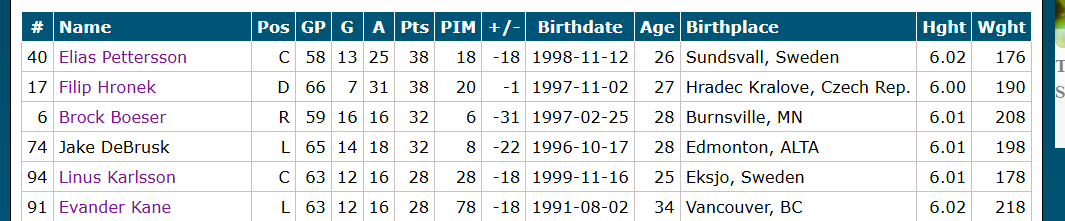 Hronek’s +/- at -1 on one of the worst defensive teams is actually kind of impressive when everyone else is pushing -20 or more.