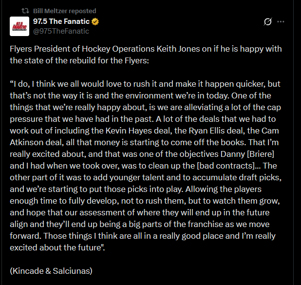 [97.5 The Fanatic] Le président des opérations hockey des Flyers, Keith Jones, explique s’il est satisfait de l’état de la reconstruction des Flyers :