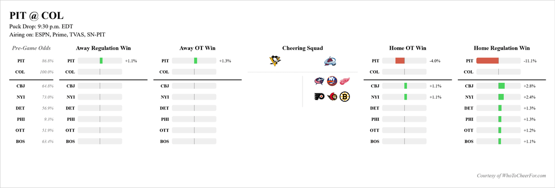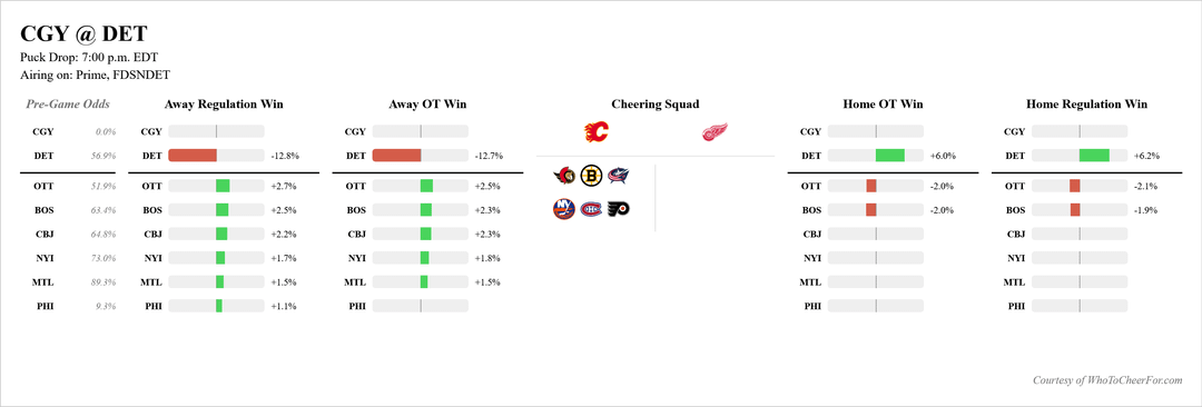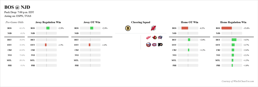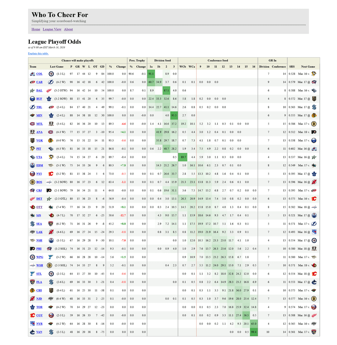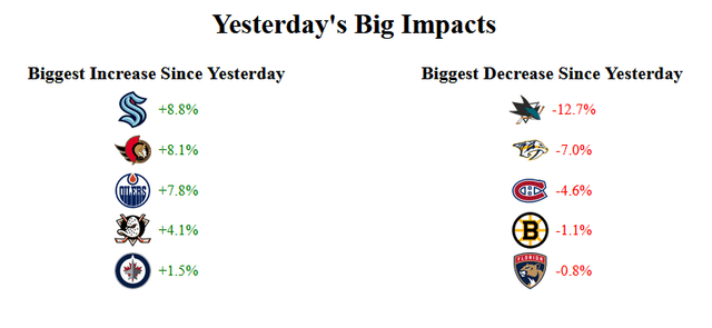 I swear this isn’t a criticism of your model, I really appreciate the work you’re doing. This is just my own thickheadedness. Yesterday’s model posted here had a Sens win against SJ as increasing our odds by less than a percentage point and the Montreal game wasn’t even posted here (presumably because it was also calculated to have no bearing on our odds) so with those things being true, how did our odds increase 8.1% yesterday? I know you said you’re making tweaks to the model, so is that the reason?