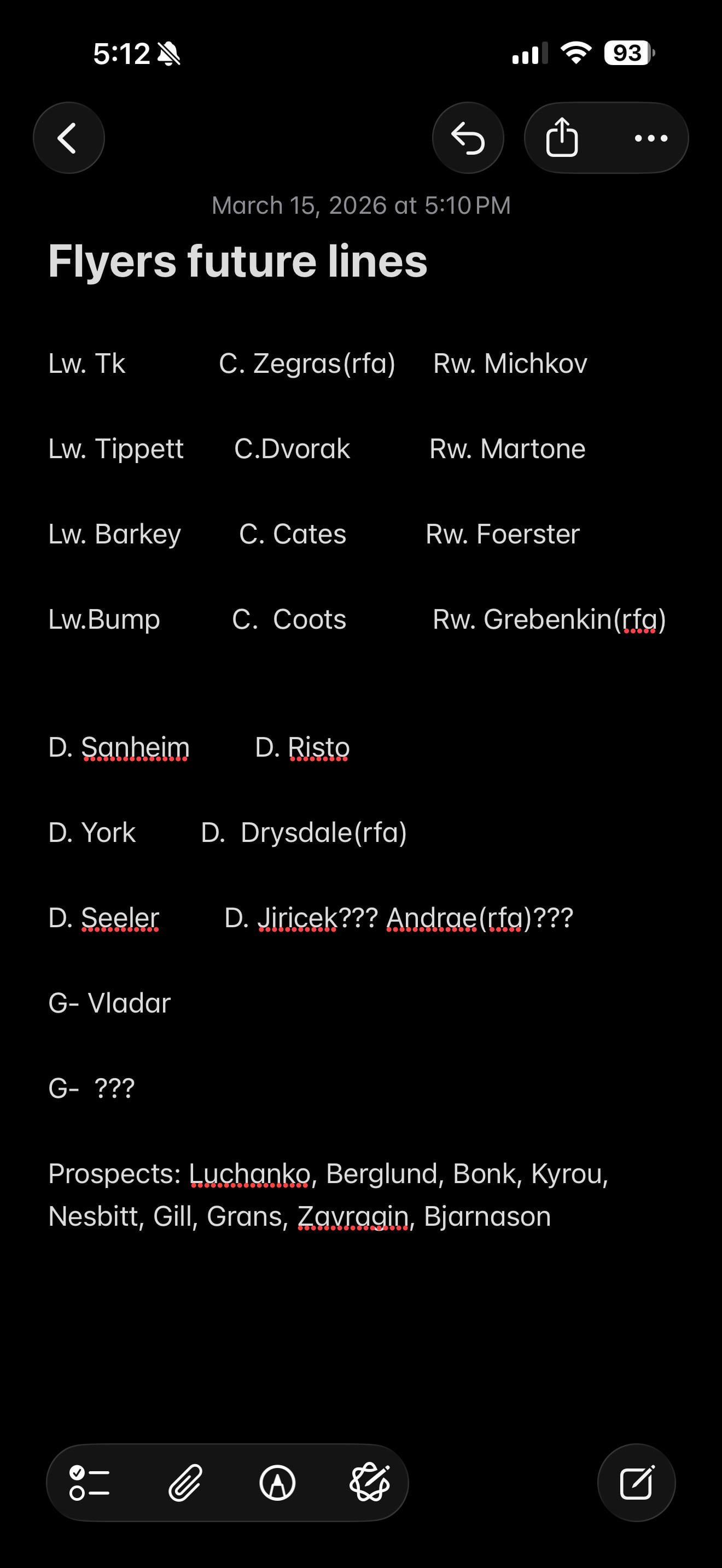 Someone had mentioned before that Foerster was LW in the cates/brink line, so I could see him staying LW and TK being RW. Other than that I like the lines. Could see Bump being 3rd line over Barkey as well will be good internal competition either way.