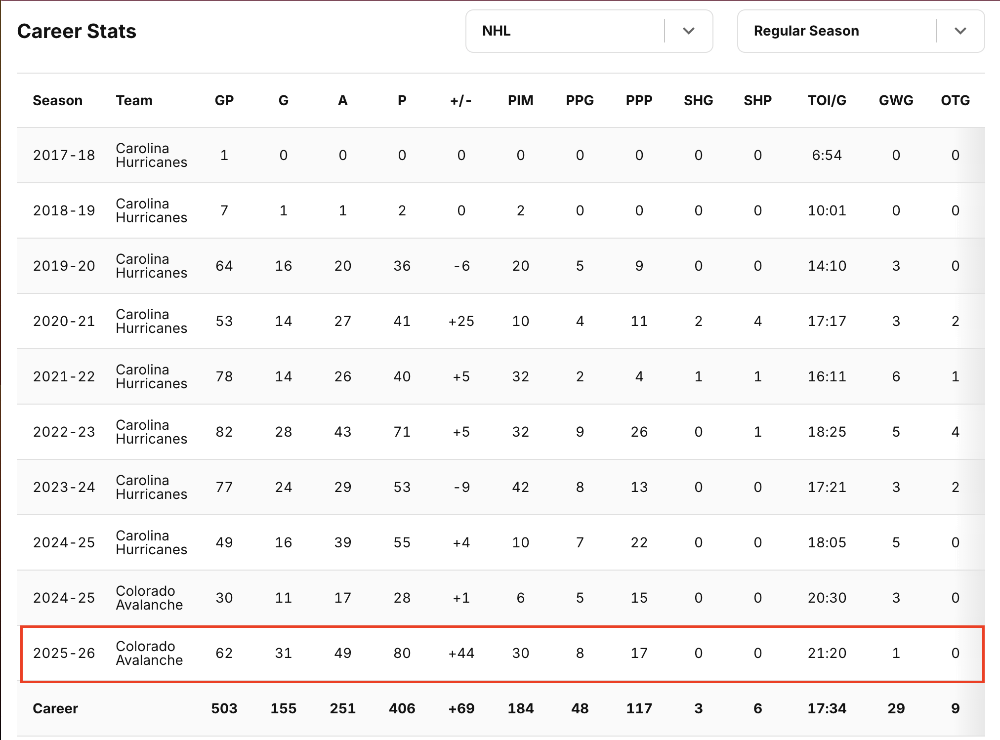 I think people still are underestimating how much playing with MacKinnon contributes. Of course Necas is an amazing player but he’s not a 100 point guy on his own. Hell look at Zach Hyman before and after pairing with McDavid. He went from 15 goals in his last season with Toronto to FIFTY FOUR.
