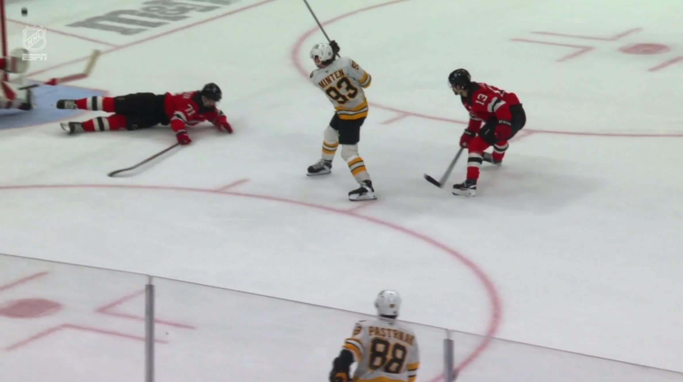 Jonas Siegenthaler des Devils avec la pile de deux jambières pour absolument ROB Fraser Minten après que la rondelle ait rebondi follement sur les planches d’extrémité (x-post de r/hockey)