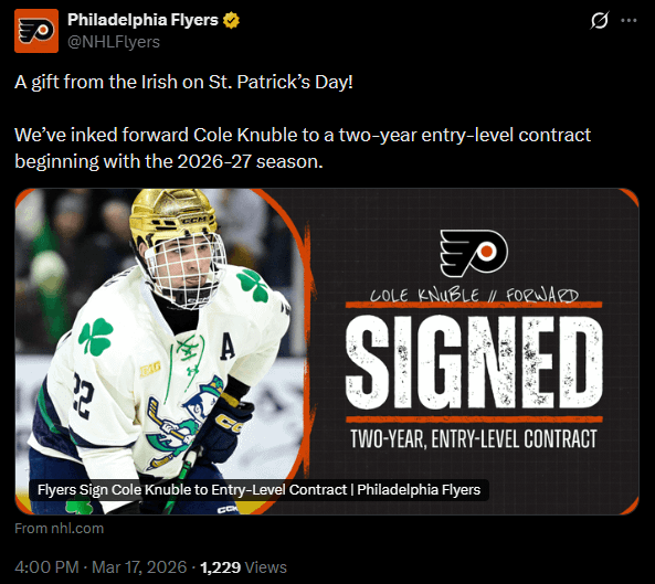 [Flyers] Nous avons signé un contrat d’entrée de deux ans avec l’attaquant Cole Knuble à partir de la saison 2026-27.