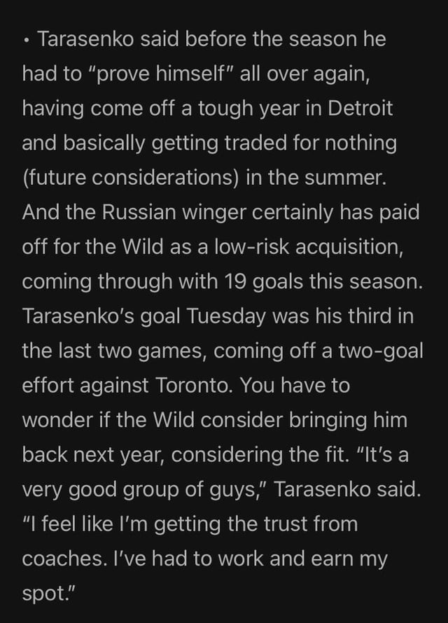 Wings/wild fan, glad to see he’s doing good with the wild, he’s been one of my favorite players for years and I was happy when he signed with the wings, really think he just wasn’t a fit and his head wasn’t completely in the game last year with his dad’s passing right at the beginning of the season. This way I will get to watch him and cheer for him, he deserves it.