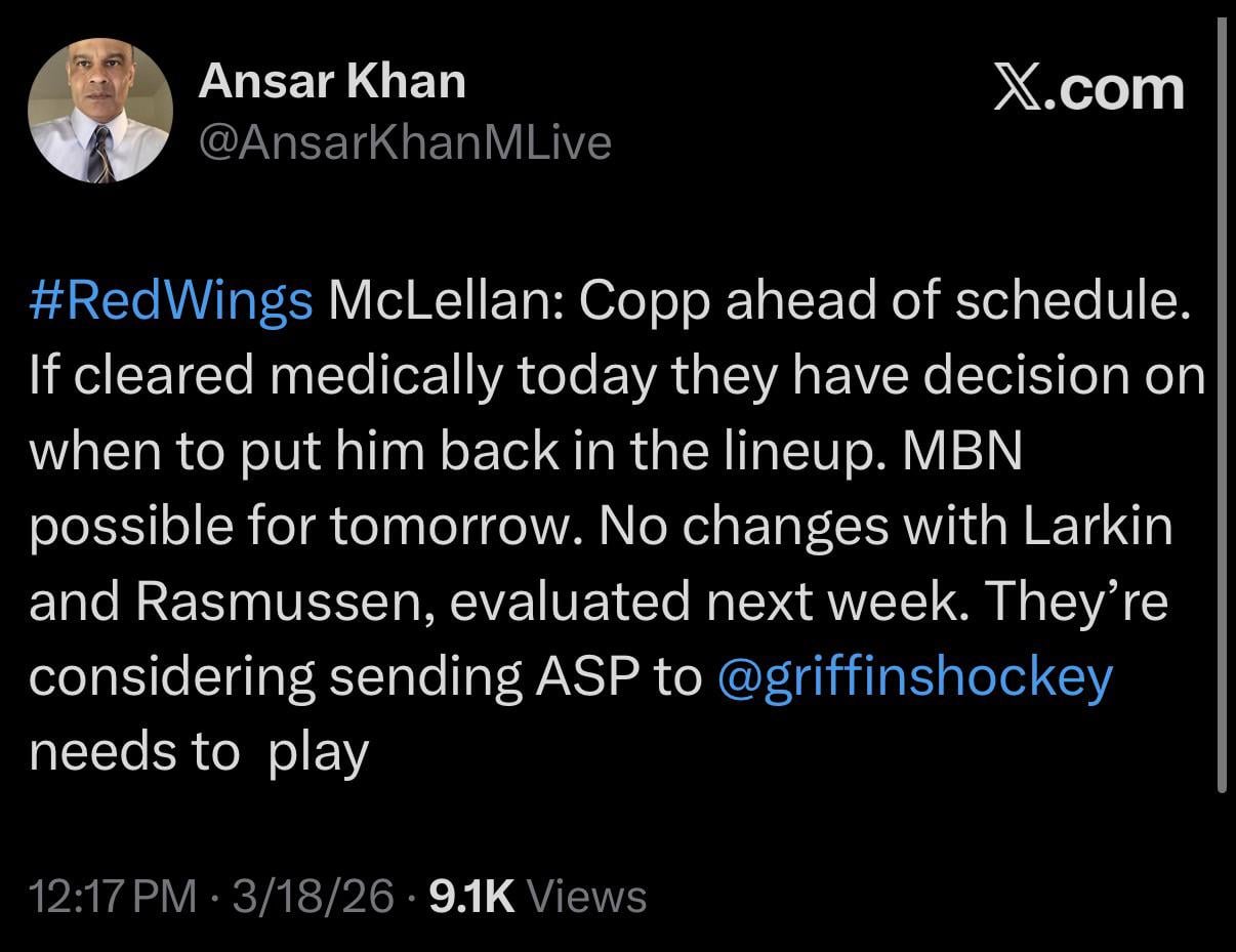 Awesome that Copp’s injury wasn’t as bad as initially thought, but Larkin is the one we need back…