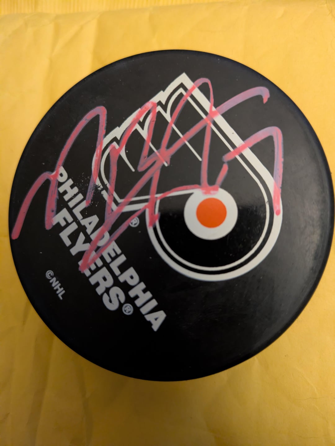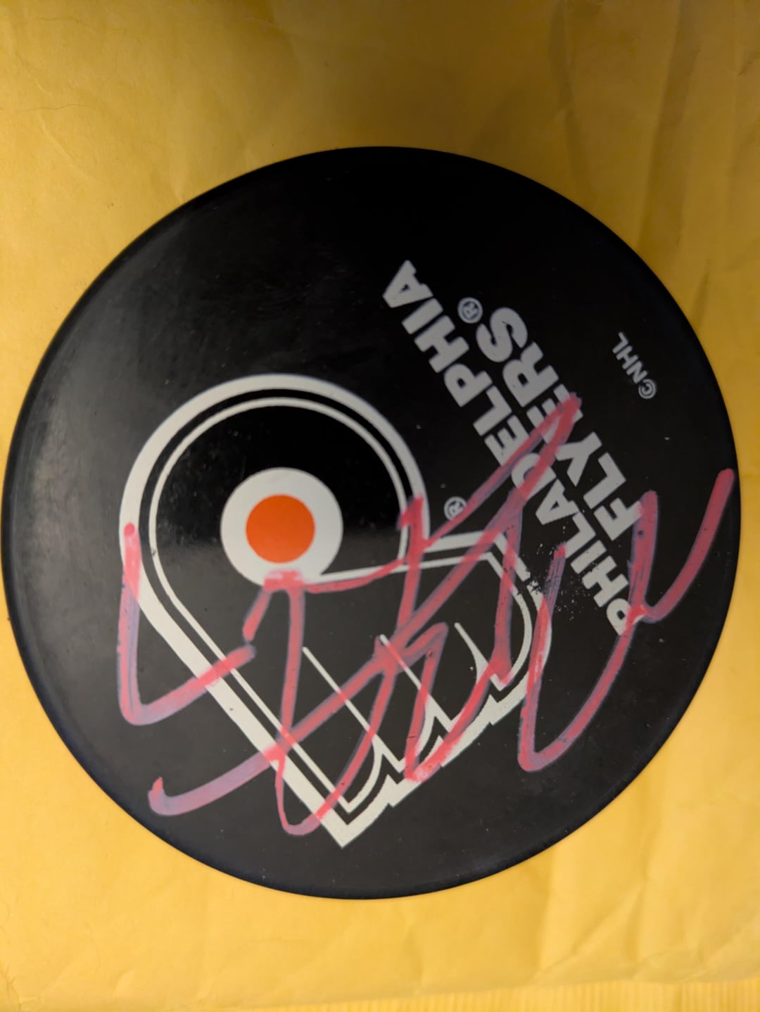 I searched for Wayne and Rod autographs (thanks for the suggestions, I wouldn’t have thought that was a ’17’). Wayne’s usually has a long straight piece in the middle, while some of Rod’s match up very close. Looks like I have a puck from Rod The Bod!