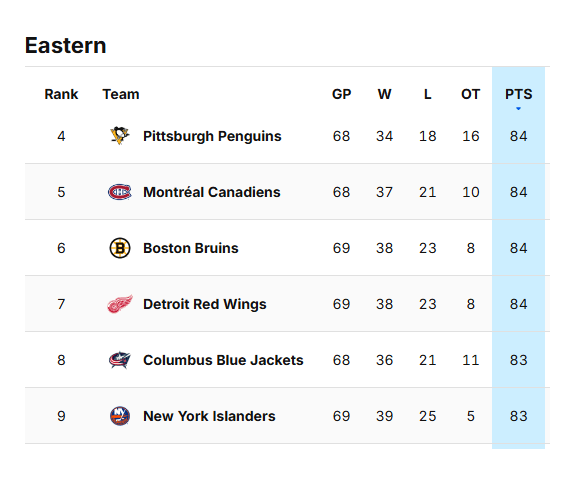And the 4th. Place team has fewer WINS than the teams below them. Remove the BS point for OT LOSSES to see how the teams should really stack up.
