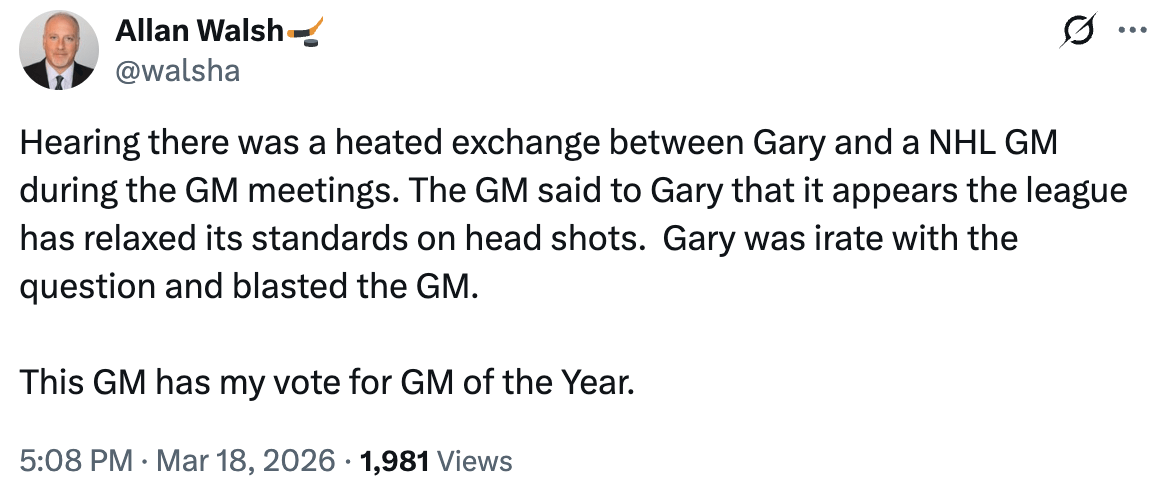 [Walsh] Il y a eu un échange houleux entre Gary et un directeur général de la LNH lors des réunions des directeurs généraux. Le directeur général a dit à Gary qu’il semble que la ligue ait assoupli ses normes sur les tirs à la tête. Gary était furieux de la question et a fustigé le directeur général. Ce directeur général a mon vote pour le directeur général de l’année.