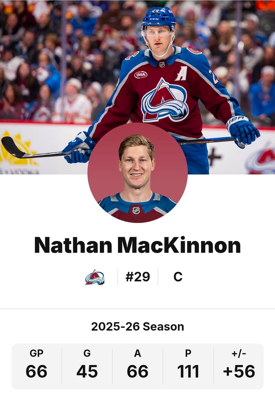 MacKinnon with 45 goals and +56 on a bad PP team is also outrageous
