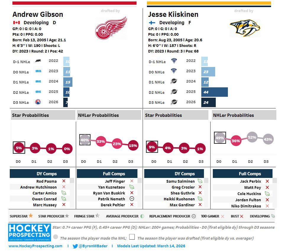 The tool also provides the players’ probability of turning into an NHLer (200+ games) and probability of turning into an offensive star in the NHL (0.7+ career ppg for a forward and 0.45+ career ppg for a defenseman).