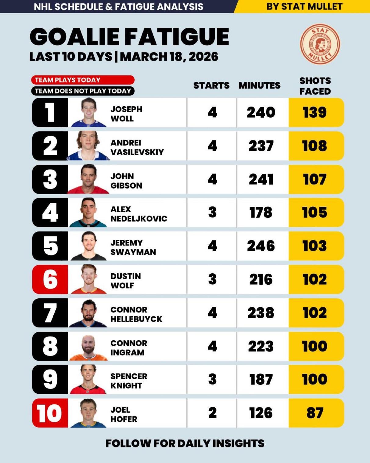Joseph Woll a fait face au plus grand nombre de tirs au cours des 10 derniers jours au 18 mars