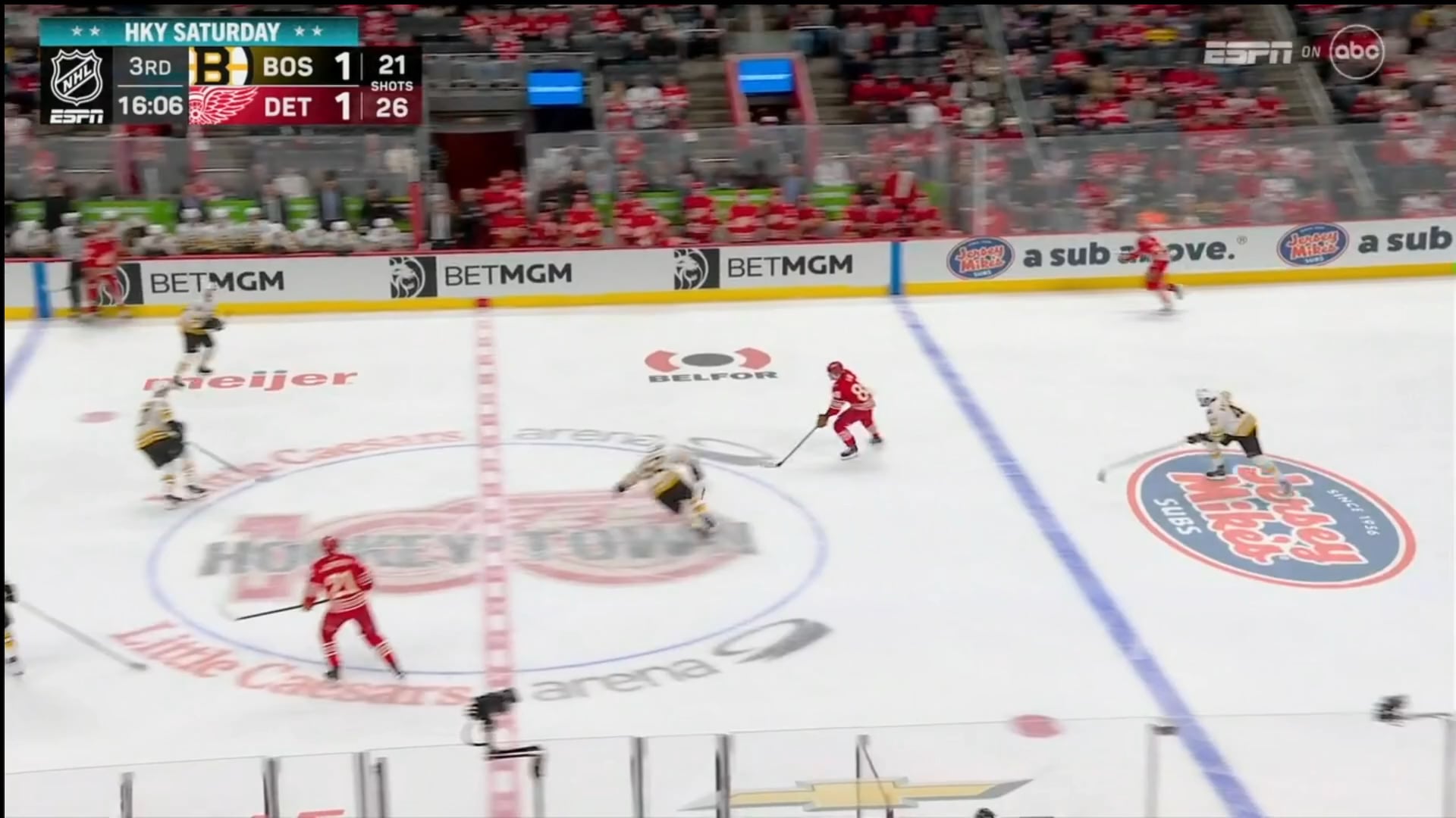 [DET (2) – BOS 1] Kastelic tente de bloquer le tir mais DeBrincat tire sur l’étagère supérieure pour prendre les devants au 3e