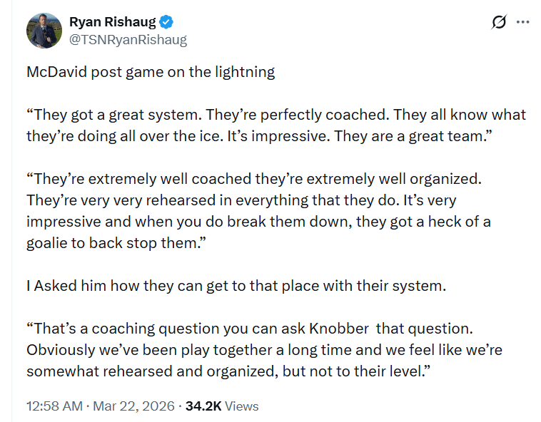 Zeev Buium on the Canucks was also praising the way Tampa played the other night. The way Cooper has them playing is the top standard.