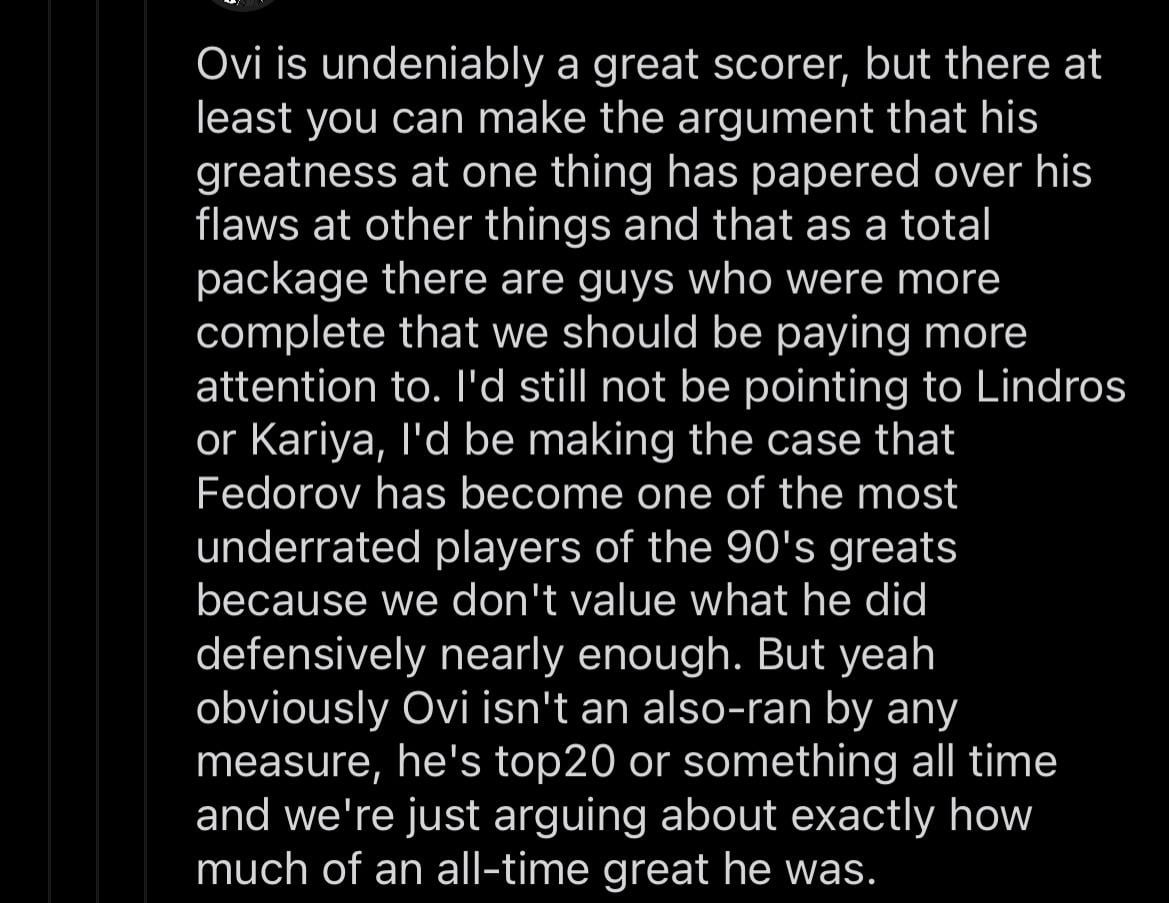 HereInTheCut 1 jour ago Did this fool call Sergei MF Fedorov underrated? The guy is a legend , and this commenter should know that.