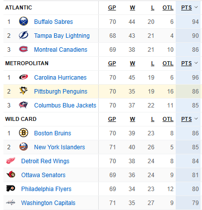 Race is heating up. The penguins will need to win a bunch of games. Isles and CBJ look really good, likely won’t be tanking out