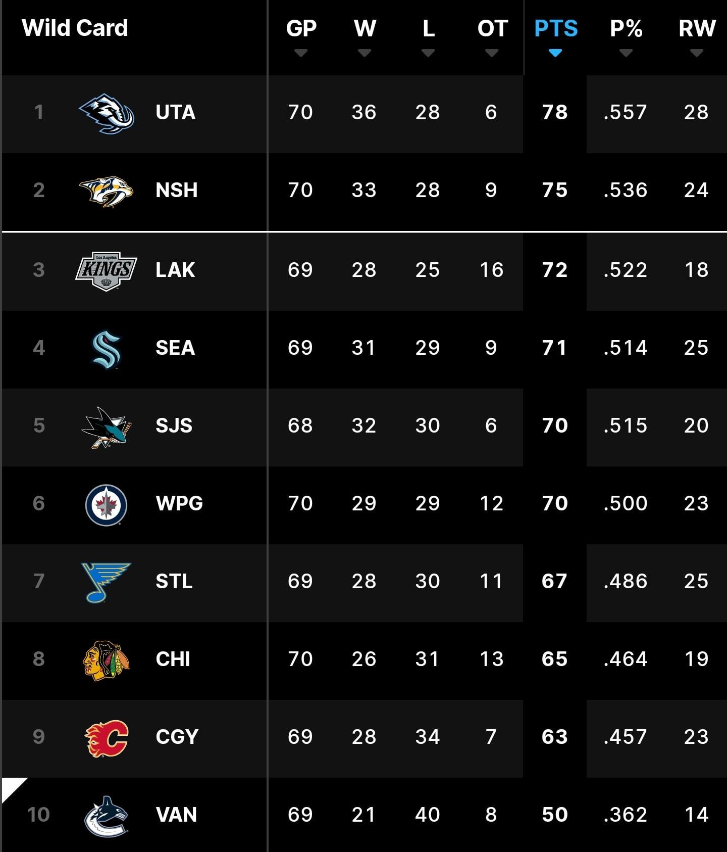 Surely we must be close to mathematical elimination already. Even if Nashville lose out, that mean LA can only win 1 more game, and even if they only win one more game Seattle can only win 2 more, SJ/WPG can only get 5 more points. Surely these teams all play each other enough to make this impossible.