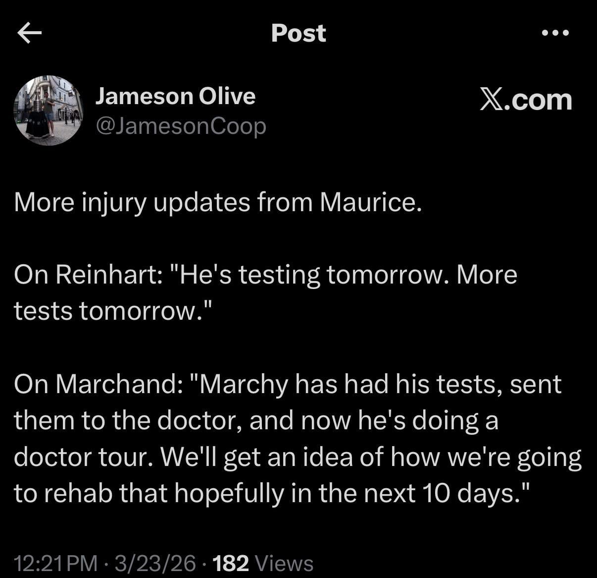 [Jameson Olive] Sur Reinhart : « Il passe des tests demain. D’autres tests demain. » Sur Marchand : « Marchy a passé ses tests, les a envoyés chez le médecin, et maintenant il fait une tournée chez le médecin. Nous aurons une idée de la façon dont nous allons le rééduquer, espérons-le dans les 10 prochains jours. »
