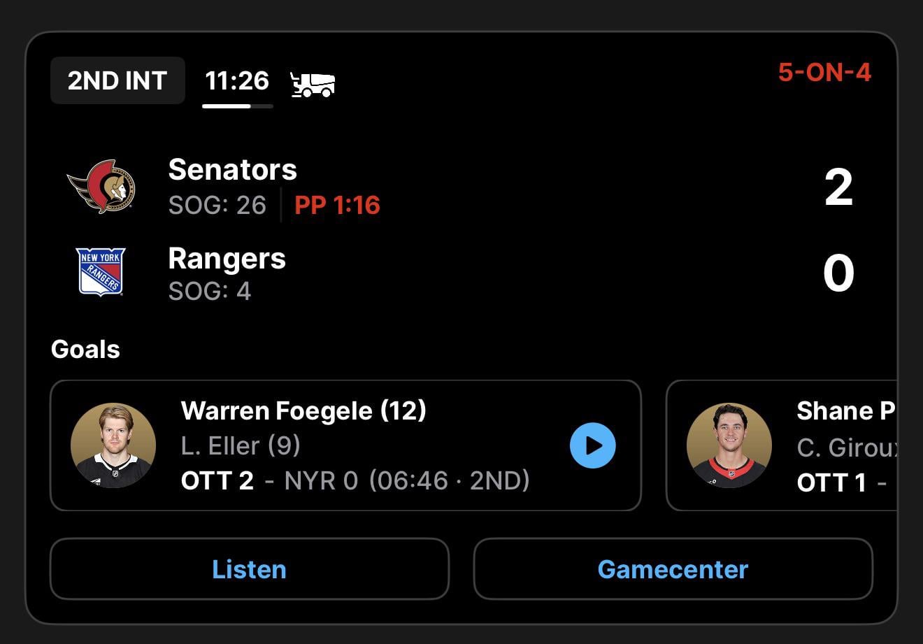 I was watching a bit of the game when the Sens took a too many men penalty and the Rangers could even get set in the Sens zone