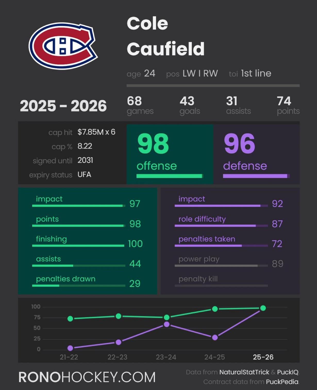 ive noticed his defensive game has improved alot. smart and disciplined with his stick usage, positions well. that and scoring 43 so far (potentially 50) is fantastic out of him