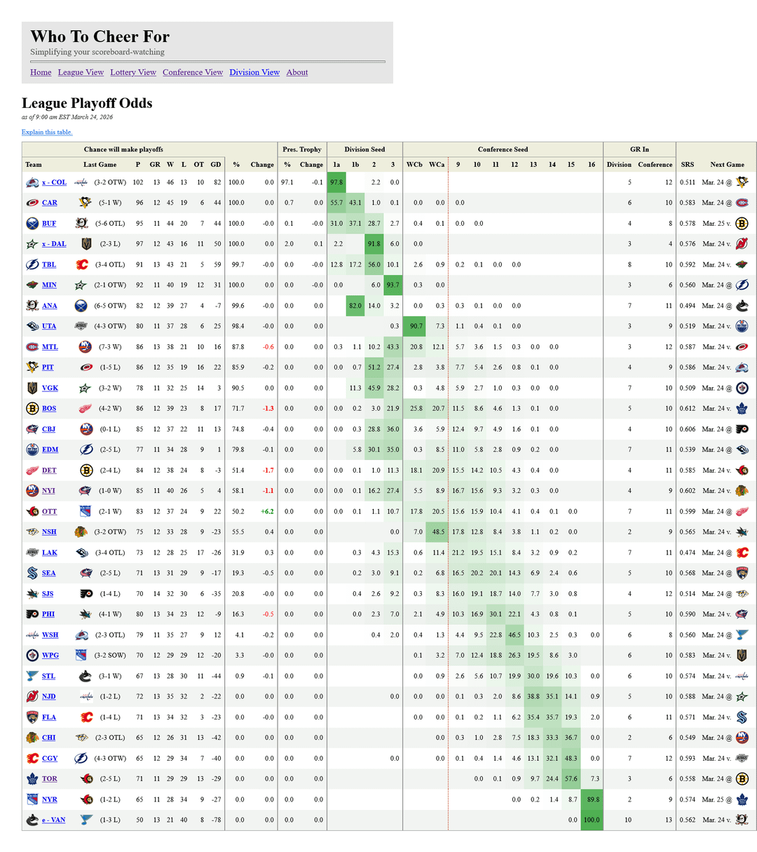 2. Sim the remainder of the season « assuming the outcome of a given game ». It would call `pullRemainingSchedule()`, which provides the sim engine with a list of games to pass through `gameSimulator()` In an effort to save cpu cycles (or whatever you wanna call it), I do not regenerate the schedule every sim, as generating the schedule hits the NHL API once for every remaining day in the season. What it didn’t do was **remove the game who’s outcome I just forced.** It would re-sim the game, with slightly altered team stats. That, combined with not properly mapping RWs and ROWs meant it was severely under-valuing winning your own games. Making that change increased the Sens chance of making the playoffs with a win last night from +0.7% to +6.2%.