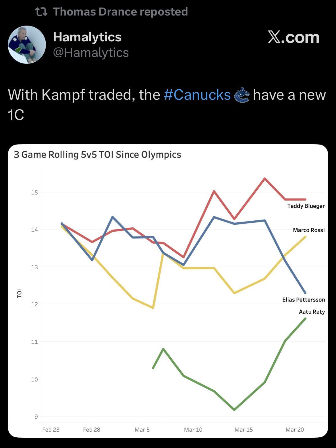 What exactly has Petey done to warrant more 5on5 time? Blueger is on matchup duty and Rossi is the 1C now. Boeser doing so well is probably equally because he doesnt have to play with Petey anymore than it is getting to play with Rossi.