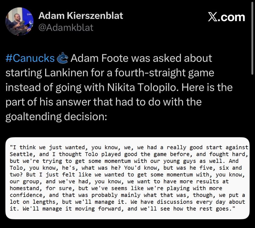 He said you know 4 times in the rambling answer and I still don’t know why they have played Lankinen so many games in a row.