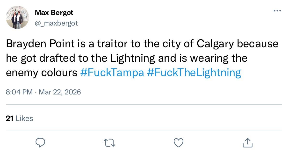 Max can come up with some more witticisms while the Lightning vie for the Stanley Cup and the Flames….do not.