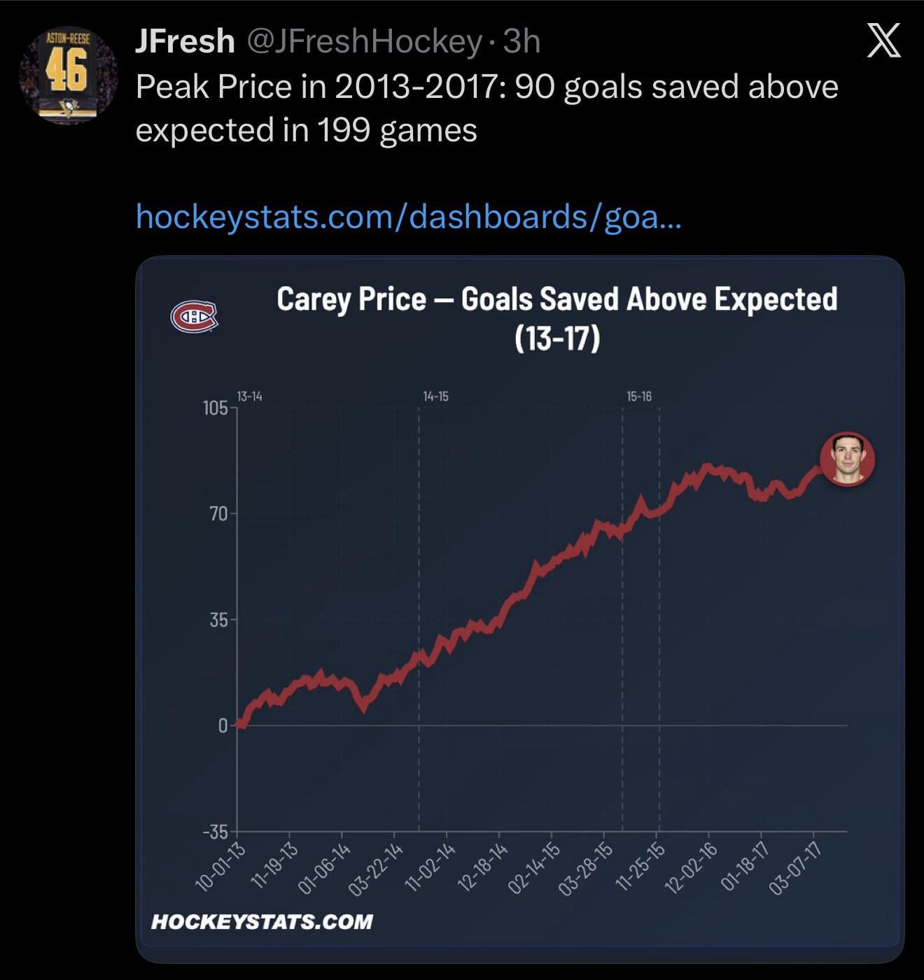 Price was inconsistent in his first few years but from 2013 to 2017, he was at Hasek’s level of dominance.