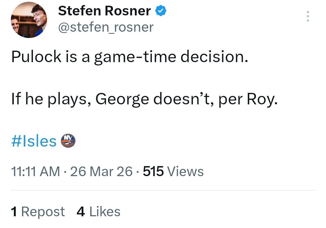 If they’re not %100 on Pulock, then he shouldn’t play. George should be playing instead of Boqvist like someone else here said. Boqvist is shit. Our defensive roster is such dog shit man smh…