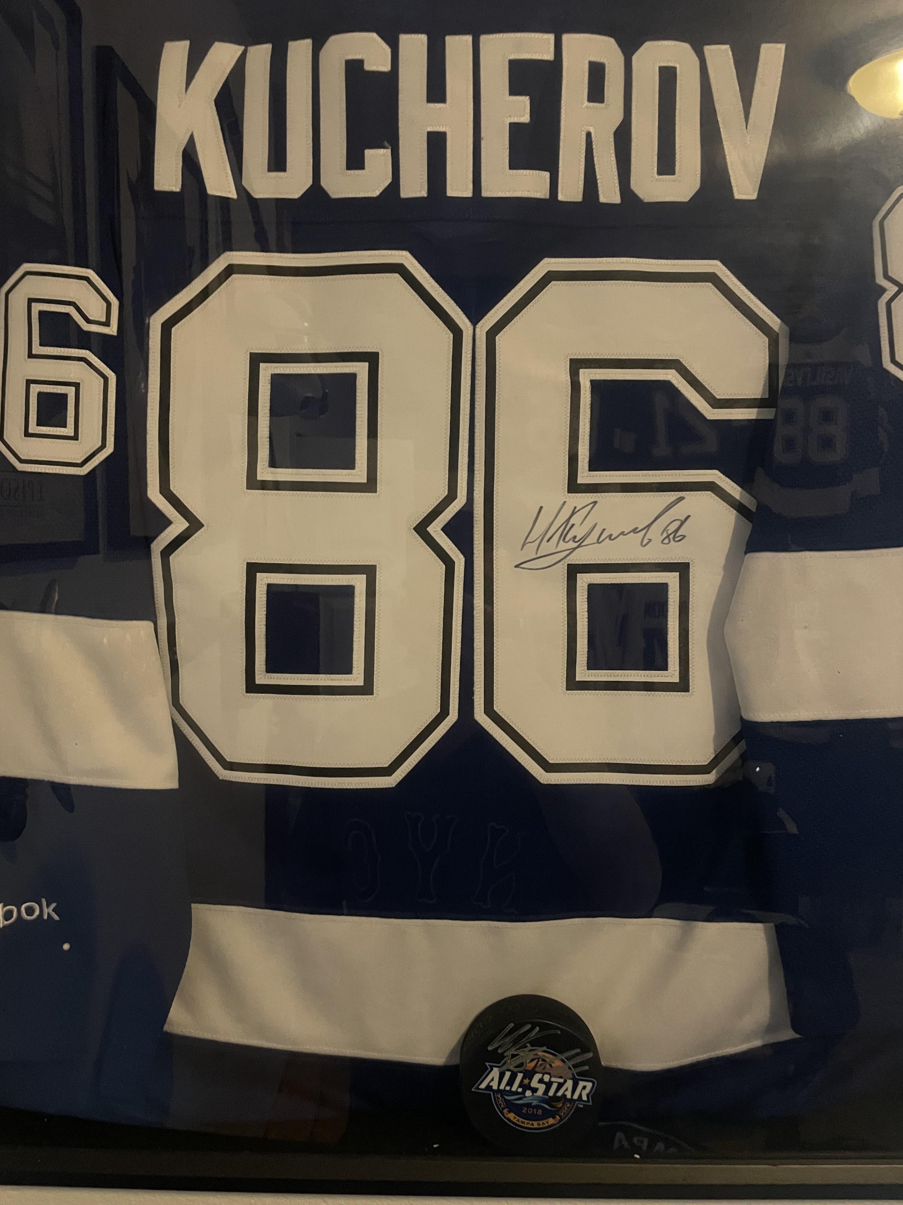 Deux de mes biens les plus précieux. Je sais que Kuch ne fait pas beaucoup de dédicaces. J’ai eu la chance de faire signer le maillot en 2017 ou 2018 lors du fan fest. Je portais le maillot avec un autre ami qui portait également le maillot de Kuch et un membre du personnel de l’arène s’est approché de nous et nous a dit « vous les garçons, vous avez choisi un bon jour pour porter ces maillots » et il nous a remis deux bordereaux pour obtenir une auto de Kucherov au niveau du club. Je dois le recadrer car un tas d’épingles se sont détachées lors de mon déménagement il y a quelques années haha. Ensuite, la rondelle que j’ai signée lors du week-end des fans de l’ASG. Je me sens incroyablement chanceux de pouvoir voir ce gars jouer à son apogée pour mon équipe préférée. Juste incroyable