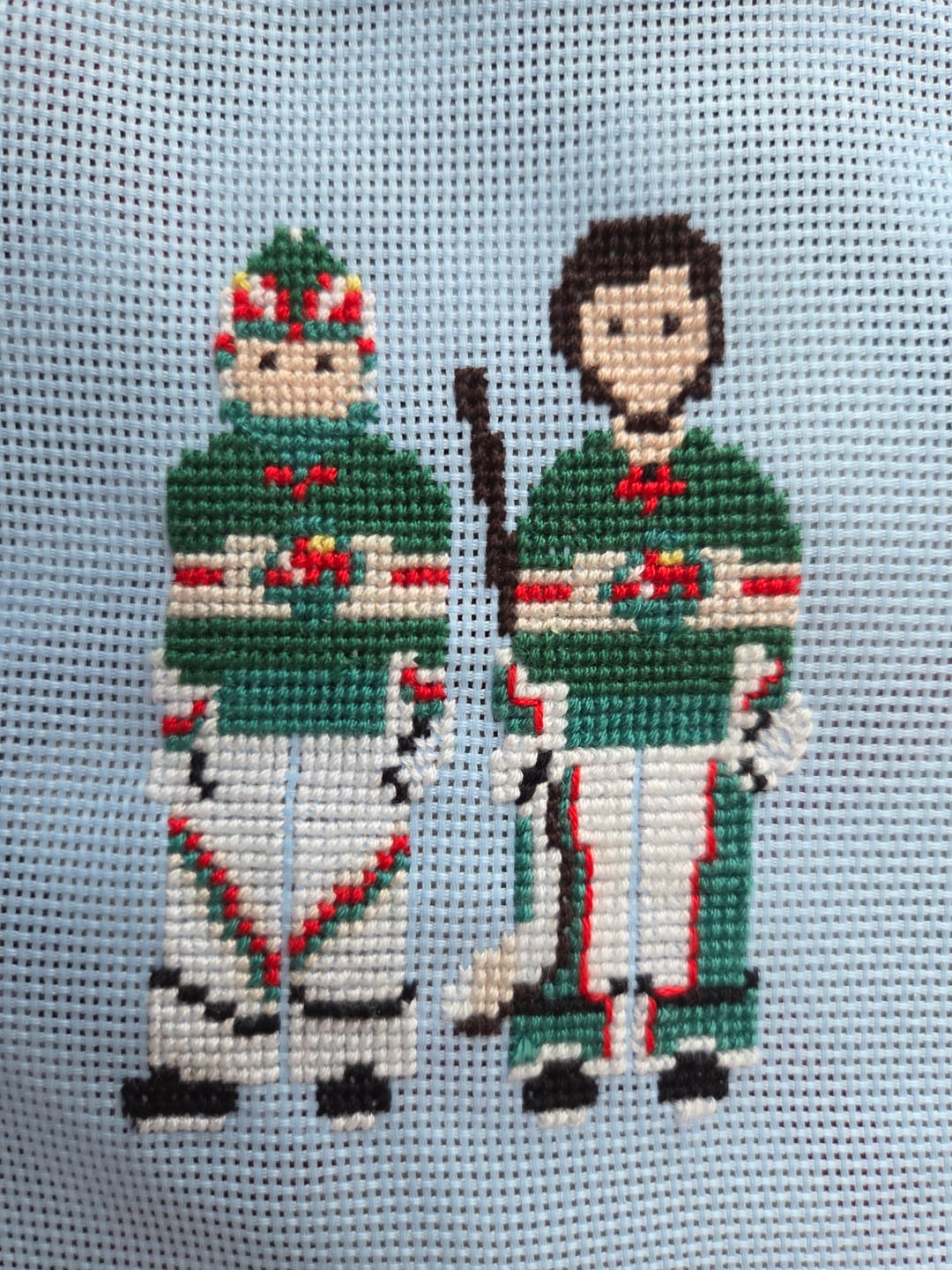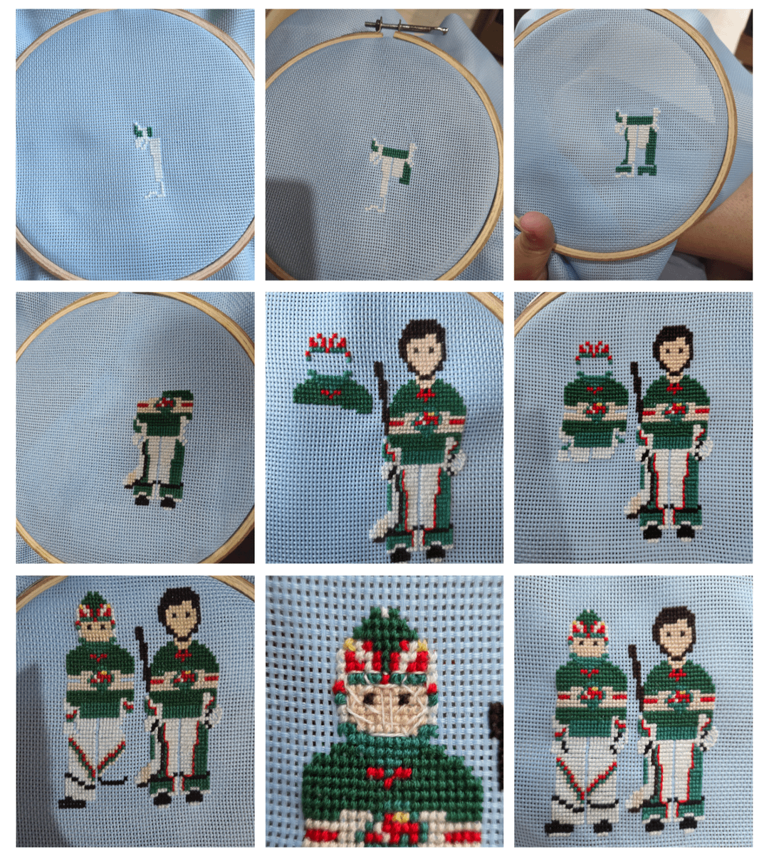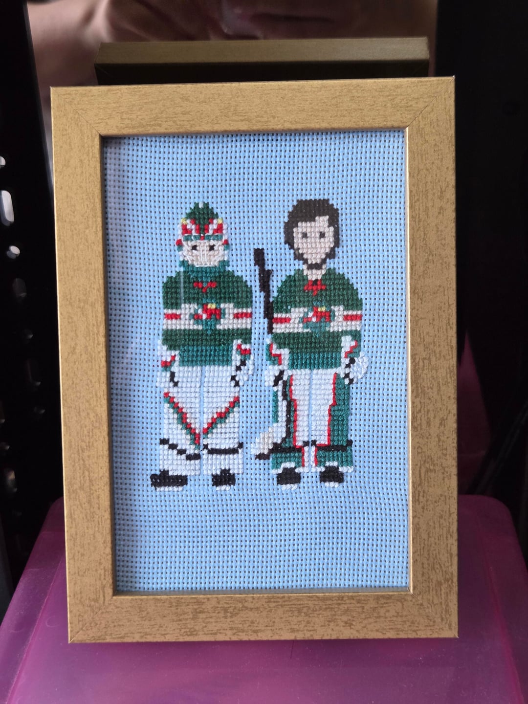 L’histoire était la suivante : je suis tombé sur un motif de point de croix de Quinn Hughes sur Etsy et je cherchais à l’acheter car je pensais que ce serait un joli petit projet. J’ai acheté les fils, le tissu et les cerceaux, mais le vendeur a ensuite retiré l’annonce. 😔 Comme j’ai déjà tout acheté, je me suis dit pourquoi ne pas créer mon propre design ! Et nous avons décidé que nos deux gardiens de but suédois fiers et joyeux forment une paire parfaite à mettre en vedette !