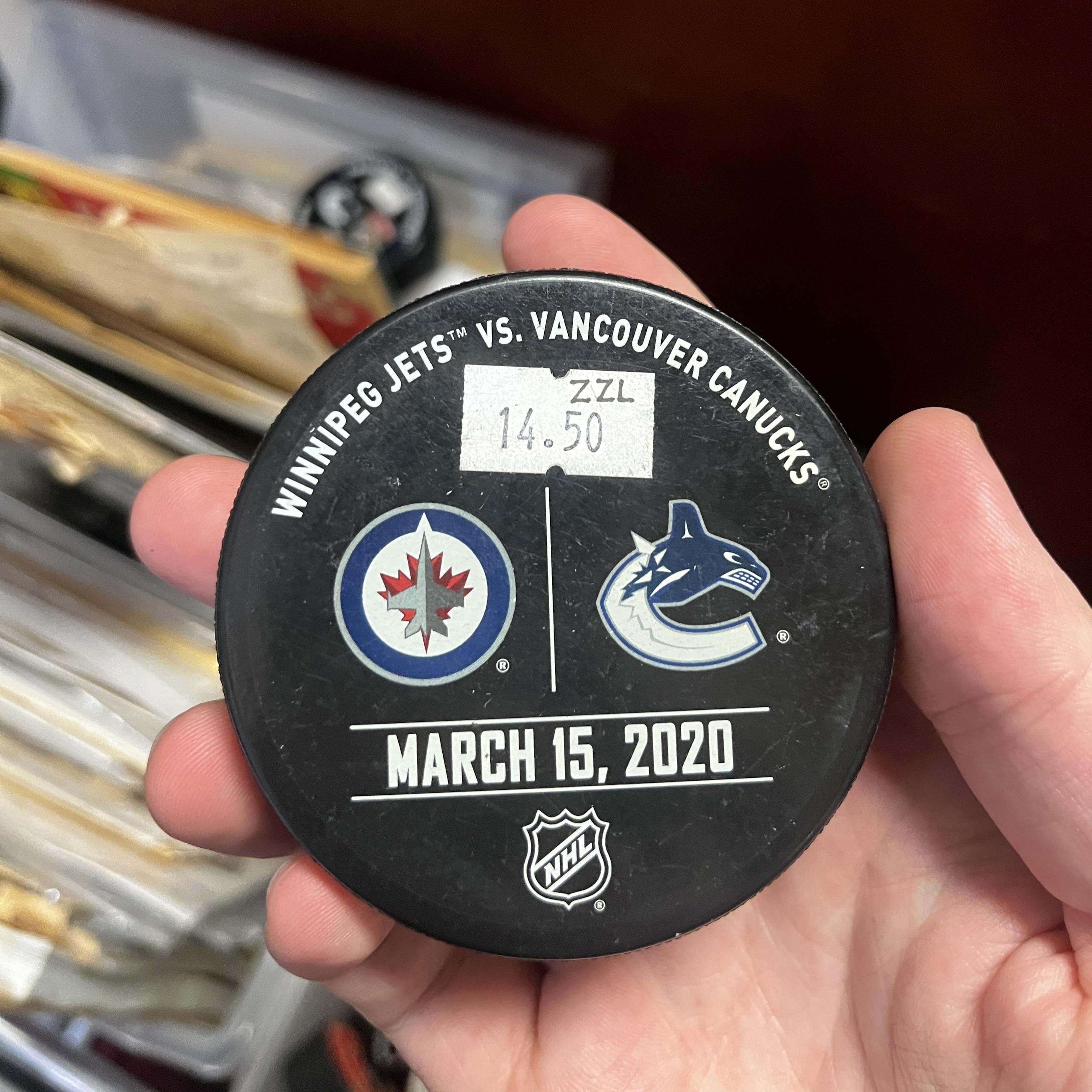 J’ai trouvé cette rondelle en parcourant le Village Antiques Mall à Fort Langley. C’est une rondelle d’échauffement pour un match qui n’a jamais eu lieu ! Ce match entre les Canucks et les Jets aurait été le prochain match à domicile après le dernier joué contre les Islanders de New York jusqu’à ce qu’il soit annulé après la suspension de la saison 2019-20 en raison de l’épidémie de COVID-19 en mars 2020. Je me demande combien d’autres rondelles pour des matchs qui n’ont jamais eu lieu ?
