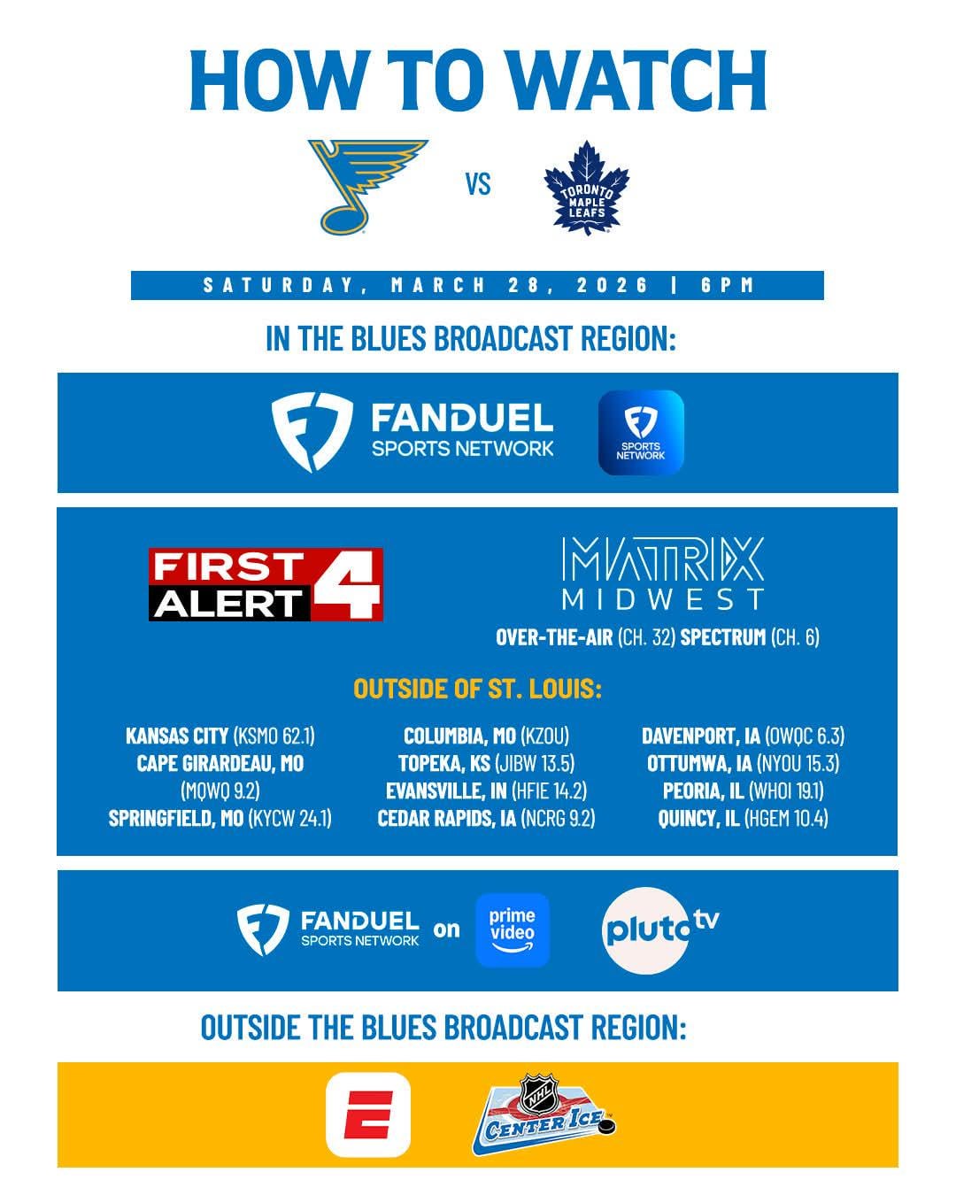 Diffusion simultanée du match à domicile de ce soir (28 mars) sur KMOV, Matrix Midwest et d’autres stations OTA — mrbmi513 Association de l’OuestBlues de Saint-LouisCentral DivisionCentrale DivisionSt. Louis BluesWestern Conference Write A CommentVous devez vous connecter pour publier un commentaire.