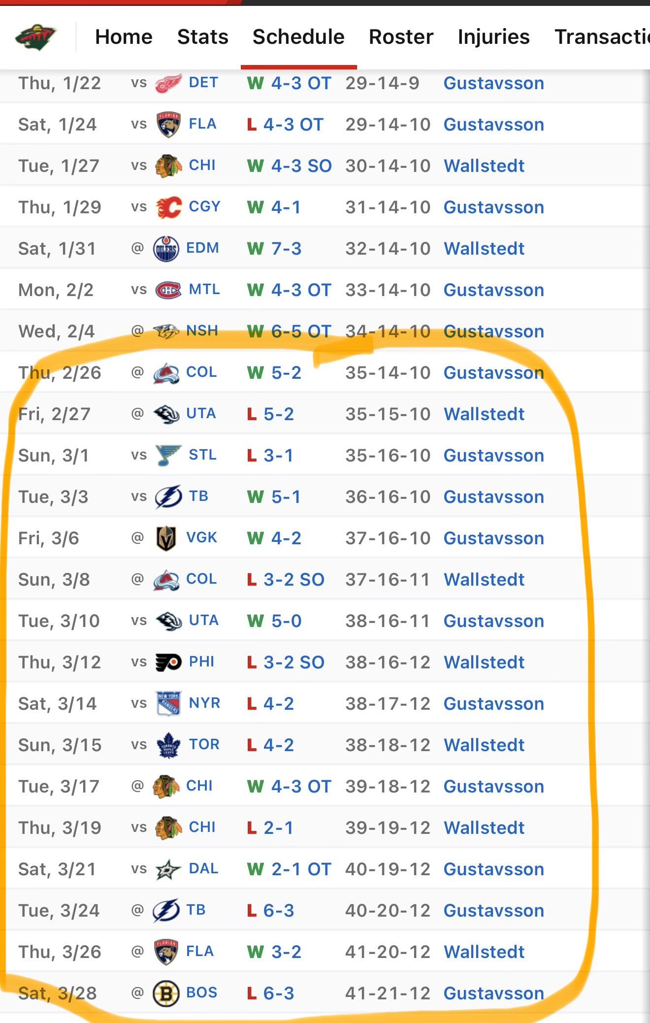 Le Wild a désormais une fiche de 7-7-2 depuis son retour de la pause olympique. Avant cela, ils avaient une fiche de 30-8-7 après un départ de 3-6-3.