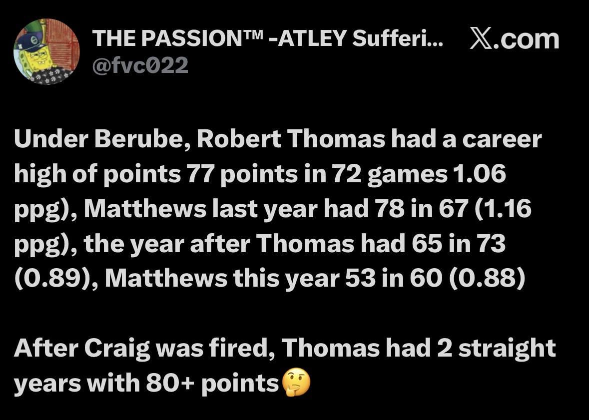 Berube is coaching badly, but this is a very misleading presentation of Robert Thomas. Forwards generally score more as they reach their prime. This season Thomas is scoring at below a PPG rate.