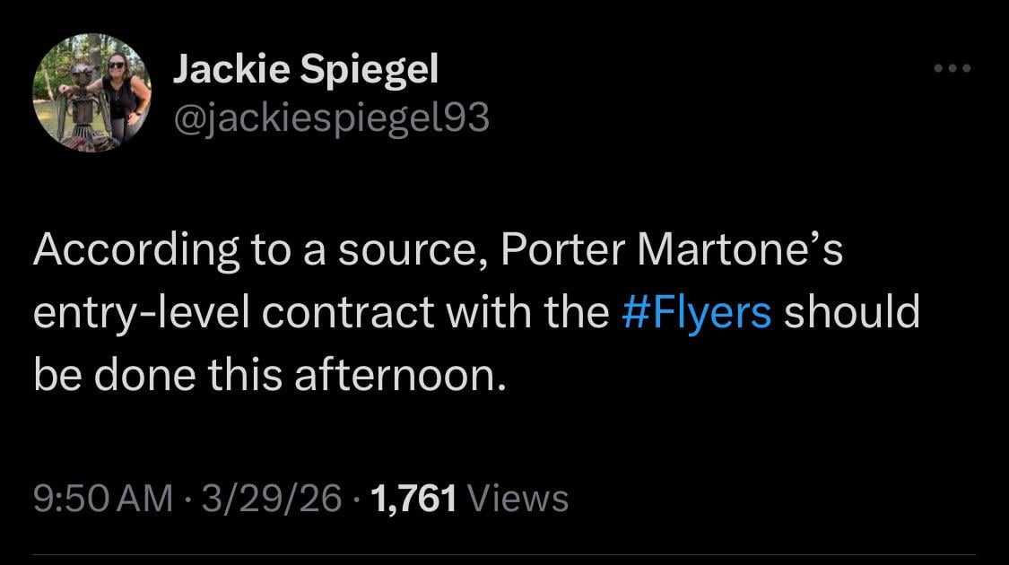 [Spiegel] Selon une source, le contrat d’entrée de Porter Martone avec les Flyers devrait être conclu cet après-midi.