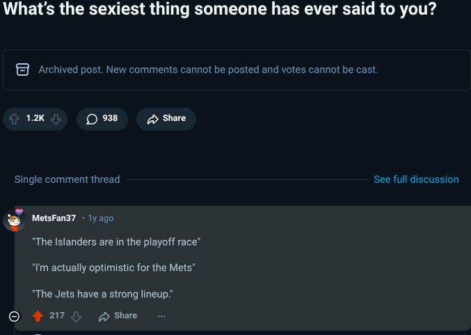 Désolé — MetsFan37 Association de l’EstEastern ConferenceIslanders de New YorkMétropolitaine DivisionMetropolitan DivisionNew York Islanders 4 Comments toyn 4 semaines ago Brother. We got Schaefer. If anything you blessed us Any-Supermarket-4190 4 semaines ago Nobody ever saying that last one to you, c’mon now! therealchrisredfield 4 semaines ago  xchester77 4 semaines ago No, no, no, no, no. I jinxed the Islanders. A few weeks ago I used my spare keys with the Islanders keychain. That has always been bad luck. That’s how they ended up being the spare keys. Write A CommentVous devez vous connecter pour publier un commentaire.