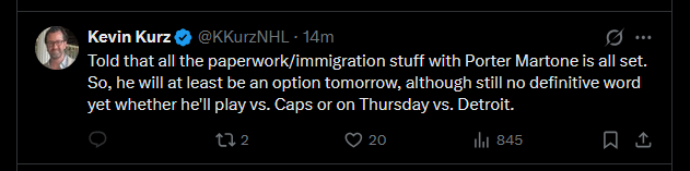 [Kurz] On m’a dit que toute la paperasse et l’immigration avec Porter Martone étaient prêtes. Donc, il sera au moins une option demain, même s’il n’y a toujours pas de mot définitif quant à savoir s’il jouera contre Caps ou jeudi contre Detroit.