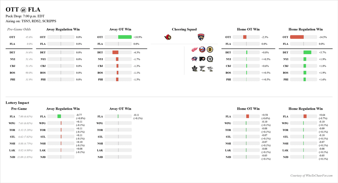 The race could be essentially settled tonight, or made even more murky. I’ve decided to push forward a tool I’ve been working on in the background for tonight, which is our [**Live Odds Tracker**](https://whotocheerfor.com/live). It is in alpha, so there will be bugs (currently it is showing yesterday’s games because the league hasn’t « shifted » to today), but it updates every 15 seconds as the games go on so you can see your odds change *in real time* as the night progresses.