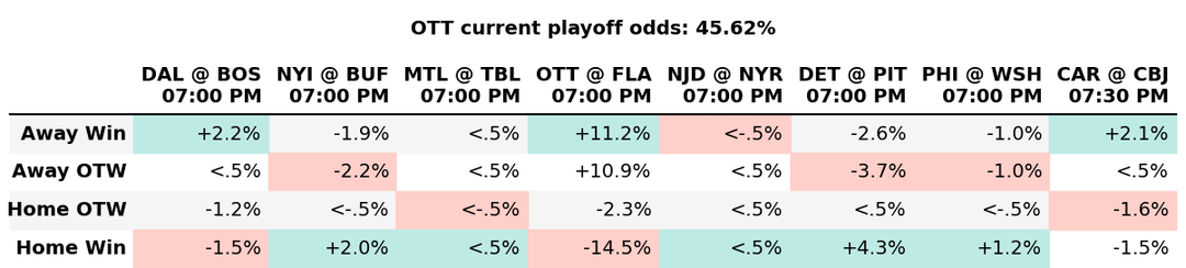 The charts don’t indicate % bump if the Sens win in regulation does it really have no effect on the % chance of making the playoffs?