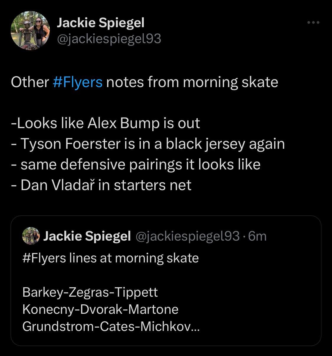 [Spiegel] Autres notes des Flyers sur l’entraînement matinal. On dirait qu’Alex Bump est sorti. Tyson Foerster porte à nouveau un maillot noir. mêmes paires défensives auxquelles il ressemble. Dan Vladař dans le filet des titulaires
