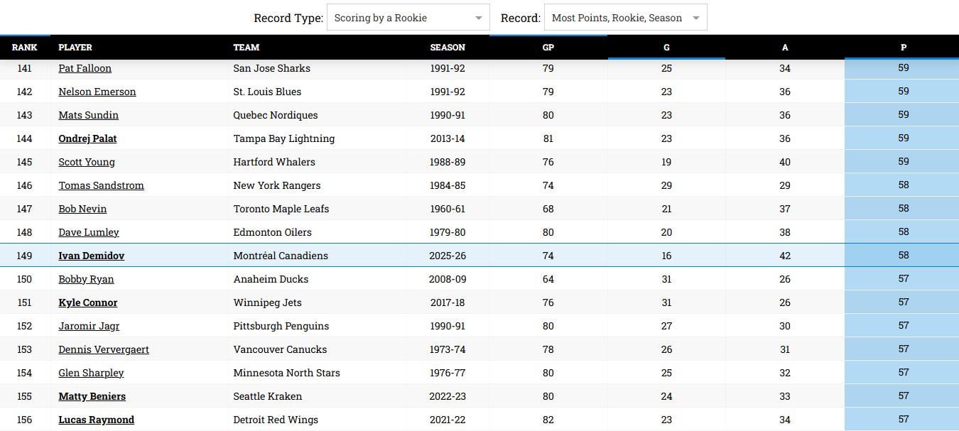 Demidov, à 58 ans, est juste devant Jaromir Jagr et juste derrière Mats Sundin pour les points lors d’une saison rookie.