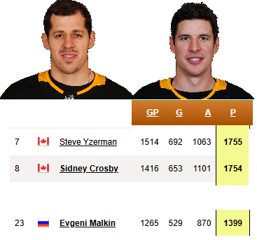 Good for both of them. I’m sure that milestone is particularly special for Sid, since Yzerman was his favorite player growing up and the person he’s said he’s modeled his game after the most. It has to be a particular kind of awesome passing your hero on the all-time list.