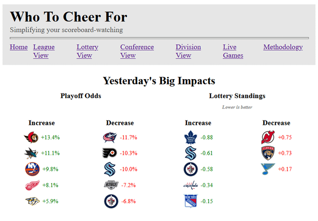 1. We got pleasant news on the Out-of-Town scoreboard last night, with 3/4 games going our way. Only one game of interest tonight, looking for Philadelphia over the Islanders.