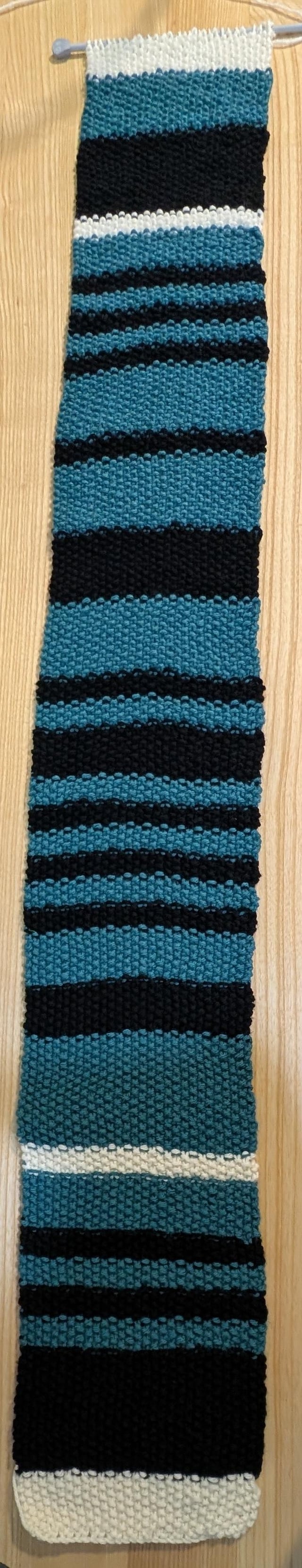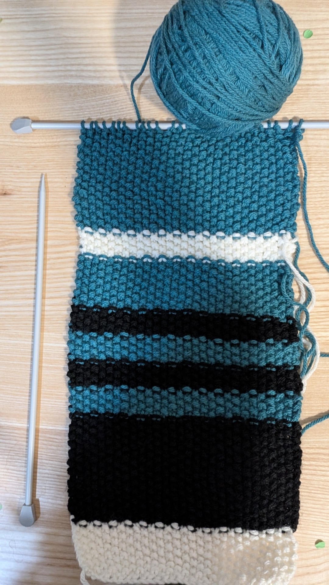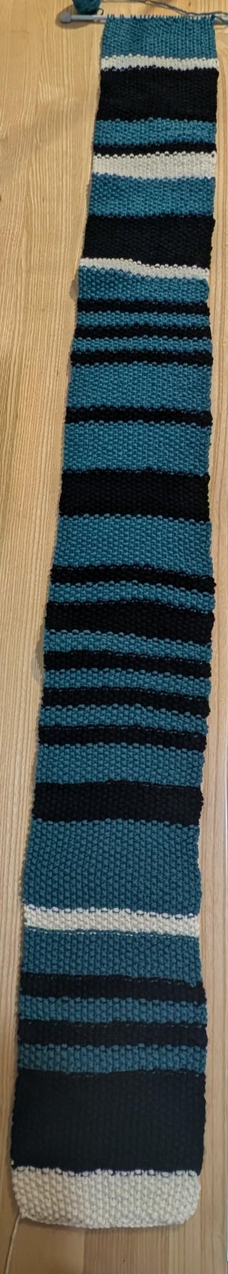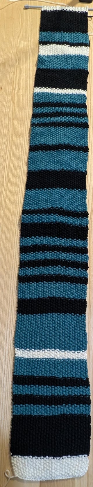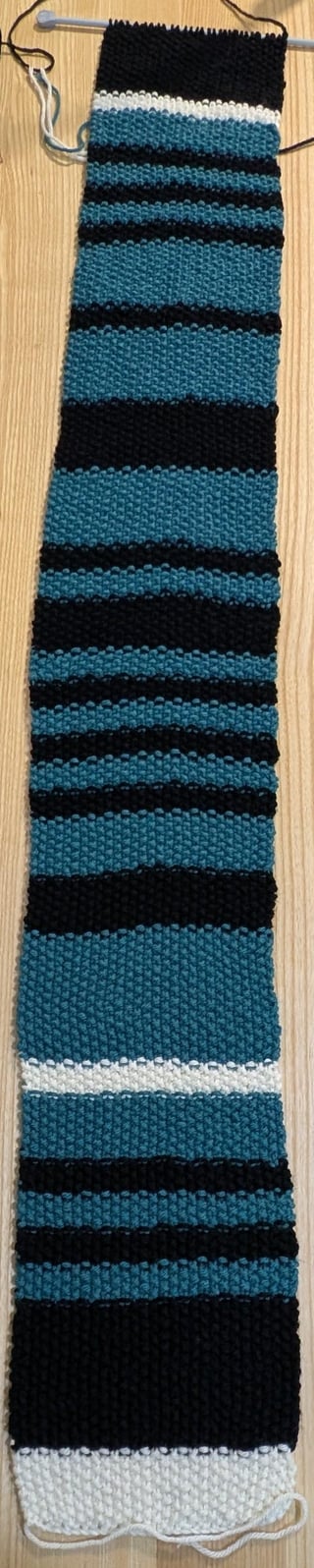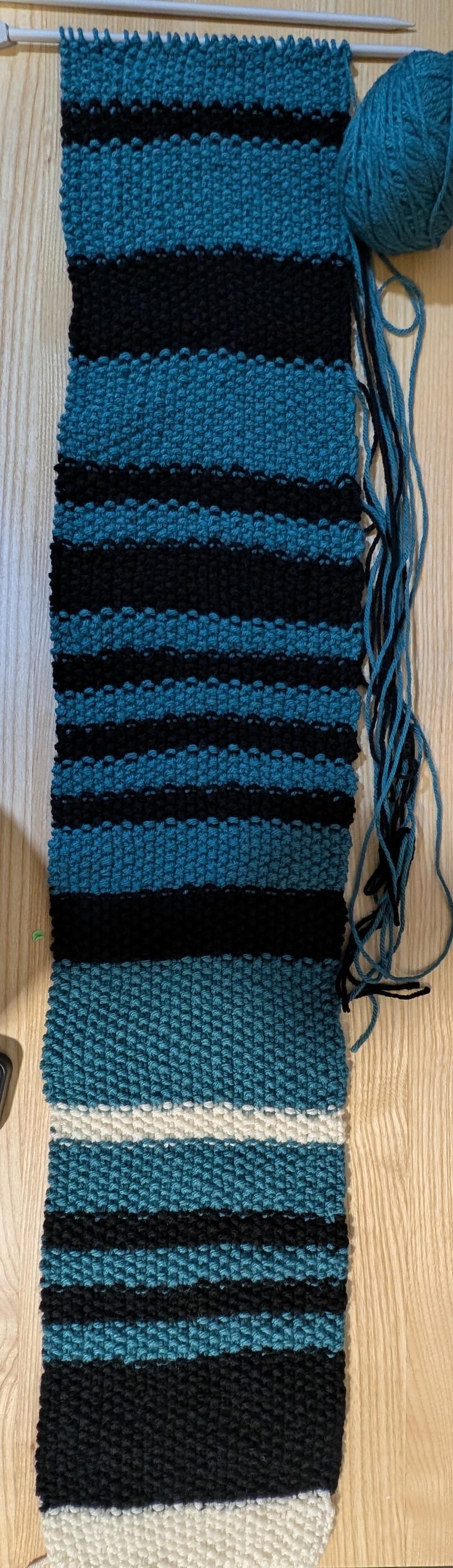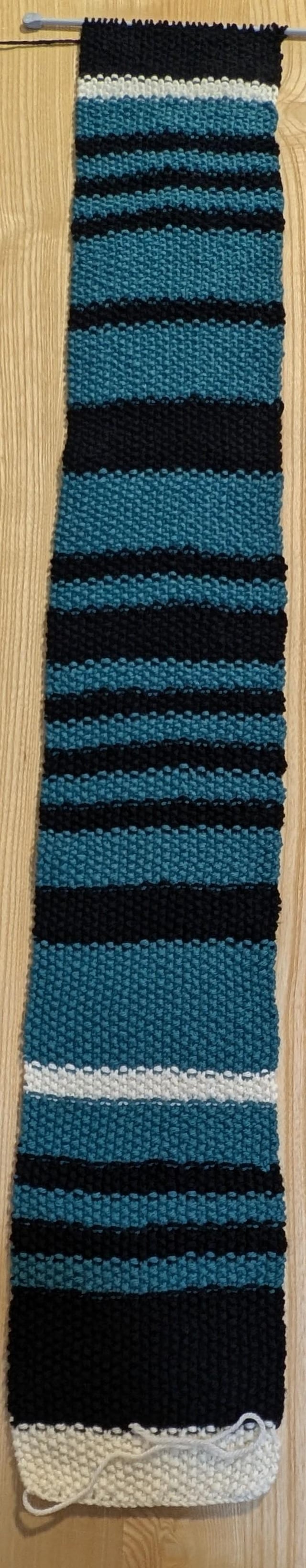 Je tricote l’écharpe San Jose : une écharpe rayée basée sur la saison régulière 2025-26 des Sharks. W = bleu sarcelle, OT = blanc, L = bande noire. Le voici après le match 74 (swipe pour les photos de progression) !