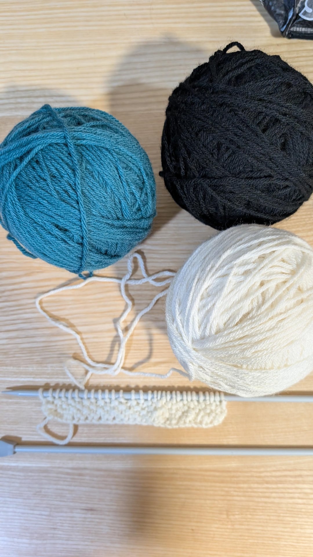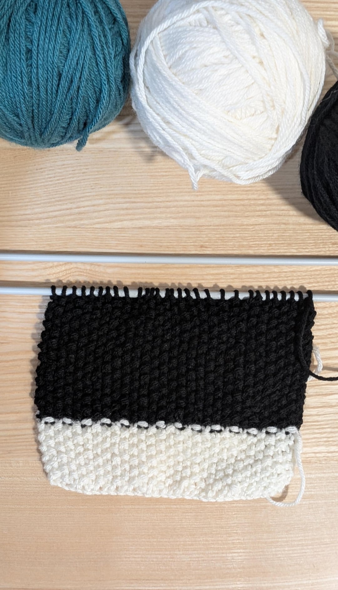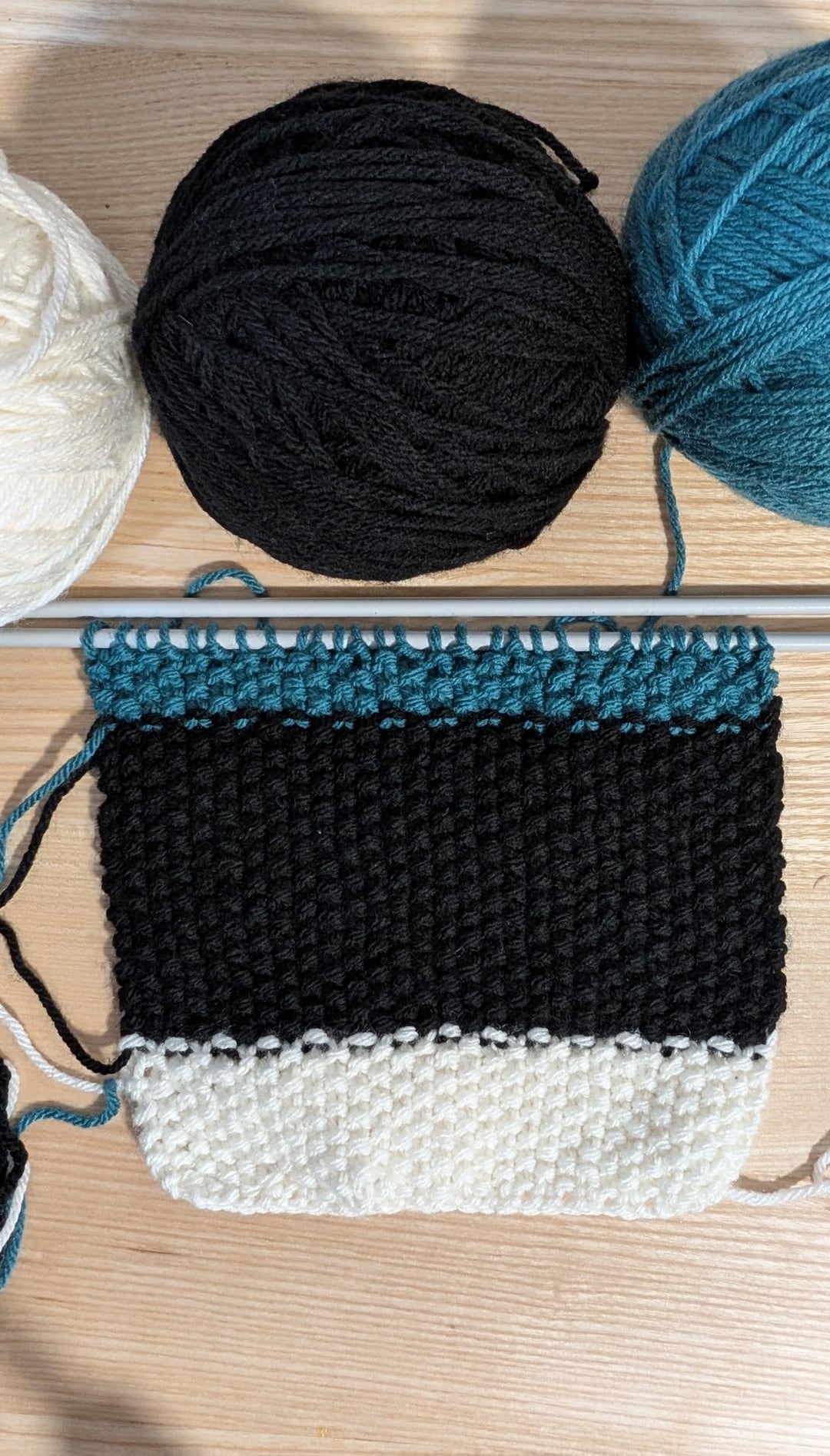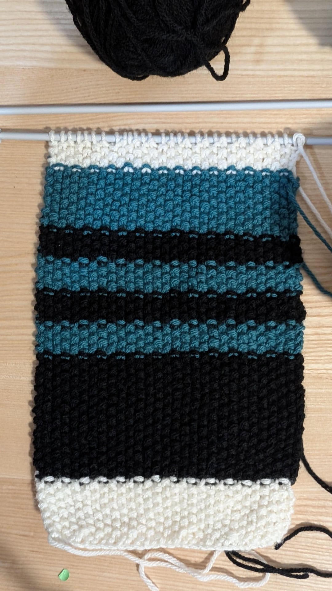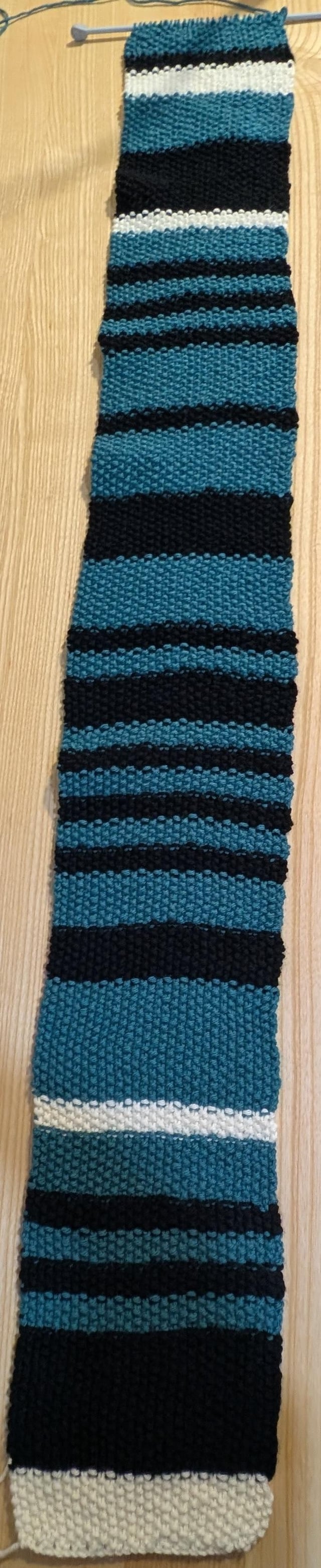 Je tricote l’écharpe San Jose : une écharpe rayée basée sur la saison régulière 2025-26 des Sharks. W = bleu sarcelle, OT = blanc, L = bande noire. Le voici après le match 74 (swipe pour les photos de progression) !