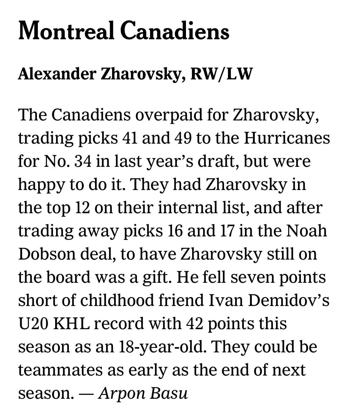 As great as Demidov has adjusted to living in North America (by all accounts, it sounds like he loves Montreal, and has also done a great job with his English), you have imagine there can only be upside to having a friend and fellow countryman coming over. It will also be a big benefit to Zharovsky to have that contact when coming over as well