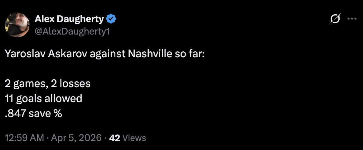 [Daugherty] Yaroslav Askarov contre Nashville jusqu’à présent : 2 matchs, 2 défaites. 11 buts accordés. .847% d’économie.