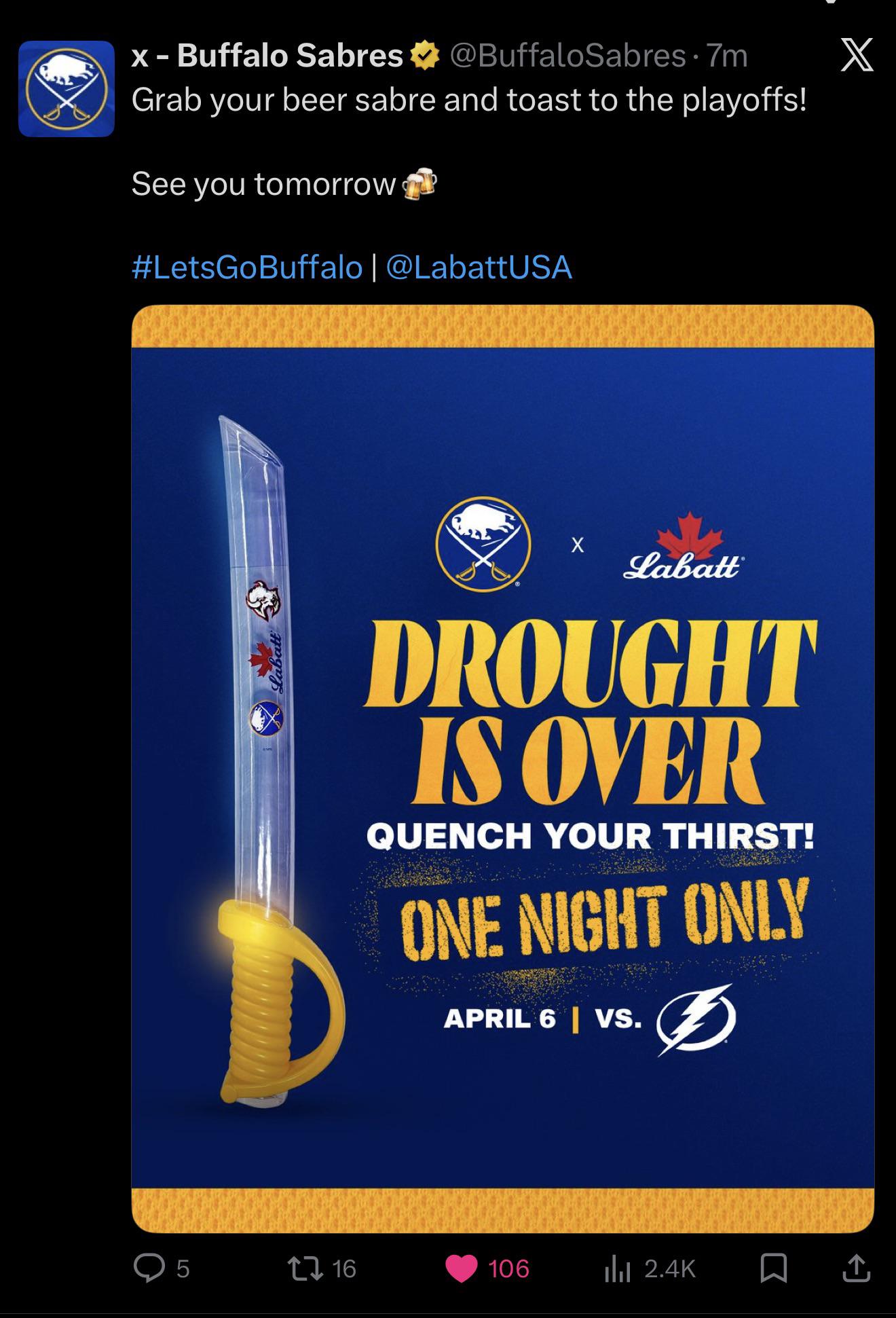 Probably not a super fan of lugging around beer swords all night long, but if anyone wants any playoff merchandise shipped out tomorrow, I live across the street from the arena and can snag some for anyone that wants any — no cost.