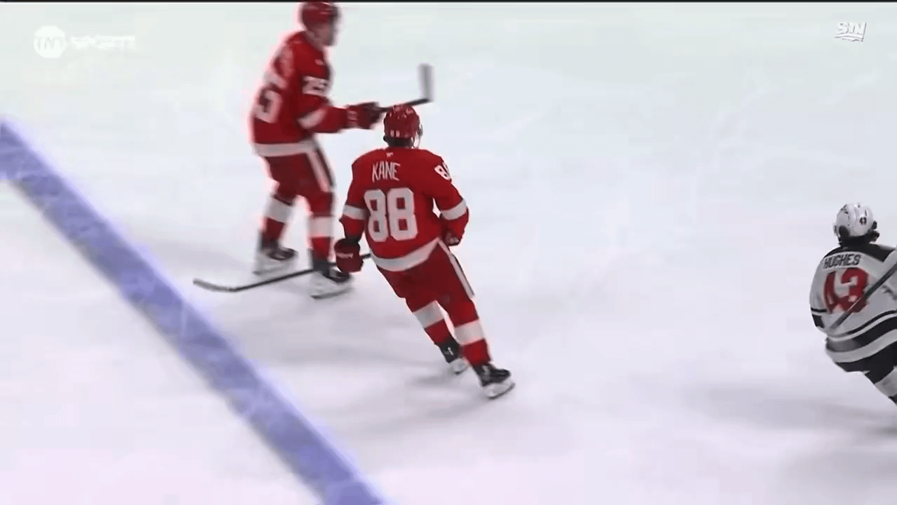 [Hana] Patrick Kane, qui a égalisé le match pour Detroit, prend une pénalité de mort cérébrale peu de temps après. Le Wild marquerait sur le PP et gagnerait la partie